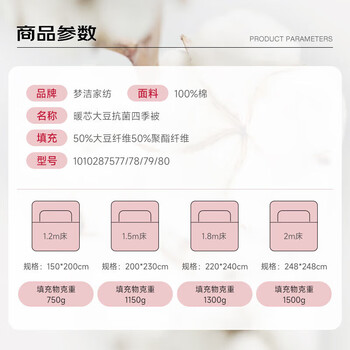 梦洁家纺暖心50%大豆纤维被抑菌纯棉春秋被四季被填充物约1150g 200x230cm