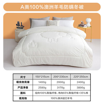 罗莱儿童羊毛被子 婴幼儿A类澳洲进口100%羊毛加厚冬被芯 220*250