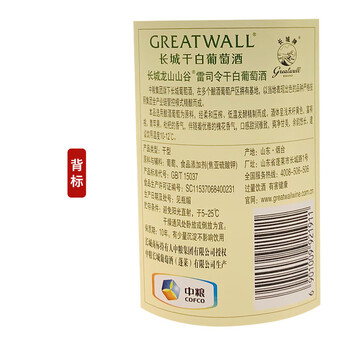 长城(GreatWall)葡萄酒 龙山山谷雷司令干白750ML*6瓶 整箱装 中粮出品