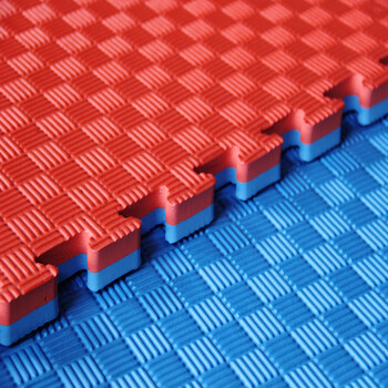 铁骥跆拳道地垫加厚1*1米专业训练散打武术摔跤垫子防滑舞蹈泡沫地垫 红蓝五道纹3A级无味3cm厚