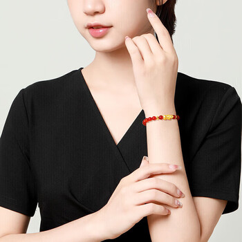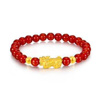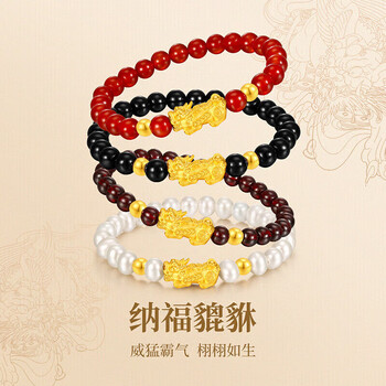梦金园 黄金转运珠3D硬金元宝貔貅手链石榴石手串女款礼物