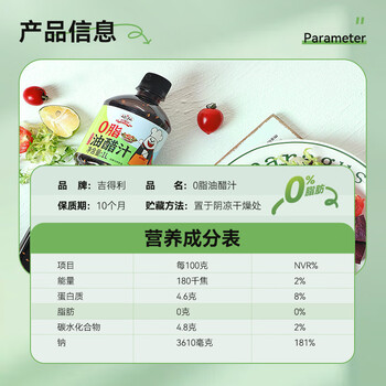 吉得利0脂肪油醋汁1L 轻食健身餐鸡胸肉蔬菜水果沙拉凉拌汁