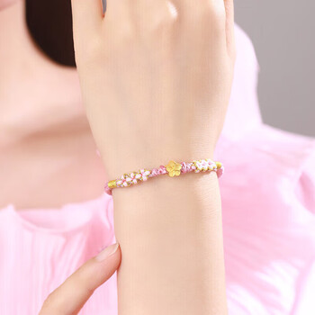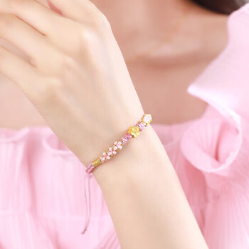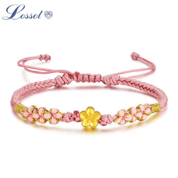 Lossot生日礼物送女友老婆小清新足金桃花黄金转运珠手链女3D硬金花朵