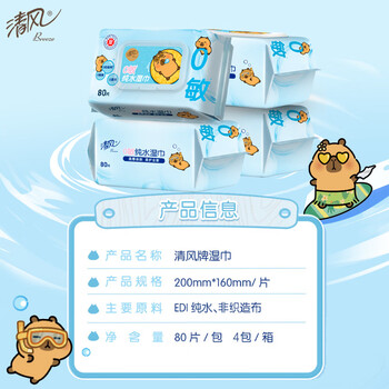 清风EDI纯水湿巾 80片*4包 不含酒精 手口可用 大包湿纸巾