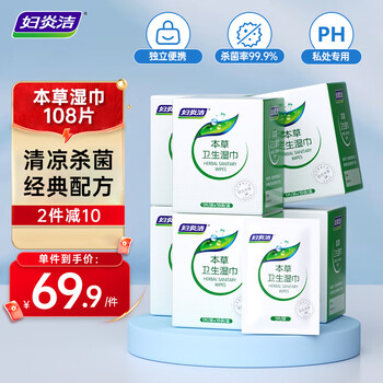 妇炎洁本草湿巾18抽*6盒卫生洁净女性私处清洁湿厕湿纸巾经期护理杀菌