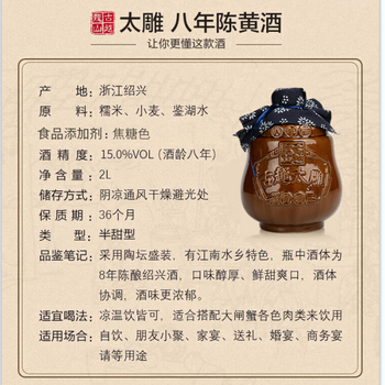 古越龙山太雕八年 半甜型 绍兴黄酒 2L 单坛装