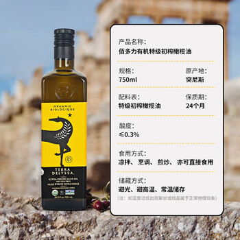 佰多力【保真橄榄油】有机特级初榨橄榄油750ml食用油