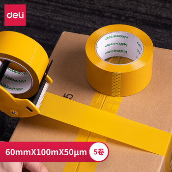 得力(deli)品正米黄色封箱带胶60mm*100m*50μm 5卷筒装 33978 快递打包 大卷封箱