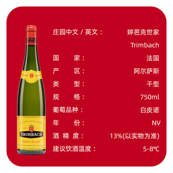 婷芭克世家(TRIMBACH) 白皮诺干白葡萄酒 750ml 单瓶装 法国 热门商品