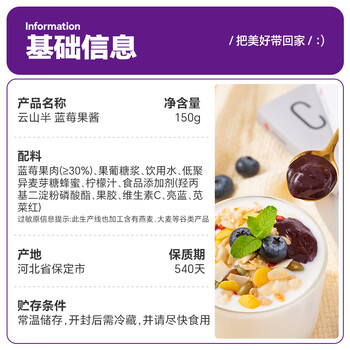 云山半0脂肪蓝莓酱150g 早餐面包吐司涂抹酱 沙拉水果酱冰淇淋酱