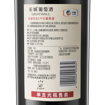 长城特选5橡木桶解百纳干红葡萄酒750ml单瓶装红酒热门商品
