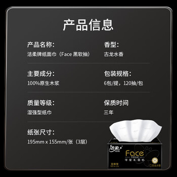 洁柔抽纸 黑Face古龙香水味加厚3层120抽*6包 可湿水面巾纸(新老品交替发货)