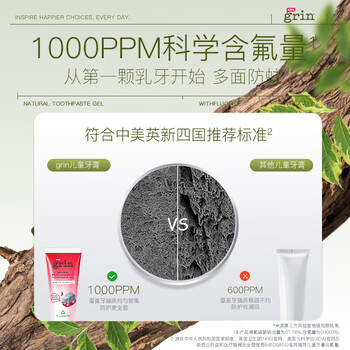 grin儿童牙膏含氟防蛀3-6-12岁宝宝婴幼儿青少年学生牙膏45g草莓味