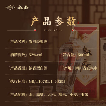 叙府 经典 浓香型白酒 52度 500ml 单瓶装 纯粮食酒
