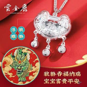 云金丽银手镯婴儿999足银福瑞长命锁宝宝银饰套装儿童生日周岁满月礼物