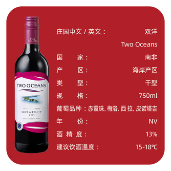 双洋(TWO OCEANS)南非 柔和果香干红葡萄酒 750ml*6 整箱装 过年送礼