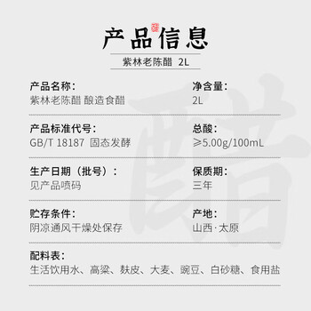 紫林醋5度珍酿老陈醋2L调味品0添加防腐剂纯粮酿造山西特产凉拌醋腌制