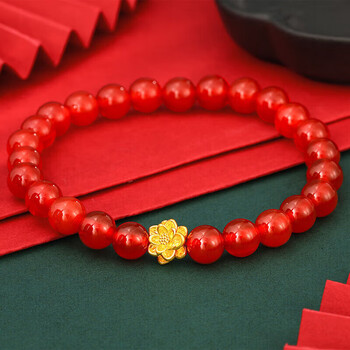 梦金园黄金转运珠足金莲花3D硬金路路通手链红玛瑙手串