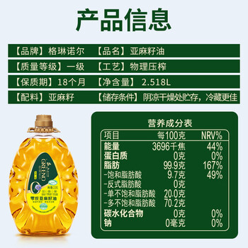 格琳诺尔0反特级亚麻籽油2.518L 冷榨胡麻油 凉拌热炒亚麻油omega3食用油