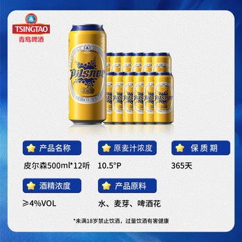 青岛啤酒(TsingTao)皮尔森拉格啤酒 500ml*12听大罐整箱装
