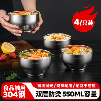美厨(maxcook)304不锈钢碗 汤碗双层隔热 餐具面碗13CM(4只装)MCWA702