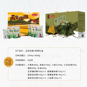 五谷田园2400g(小黄米400g+燕麦片400g+小麦仁400g+小玉米渣400g+糙米400g+红米400g)+燕之坊粽情礼盒2000g(五芳猪肉粽100g×2+板栗猪肉粽100g×2+甜味赤豆粽100g×2+香糯蜜枣粽100g×2+绿豆百合粥150g×4+八宝粥150g×4)