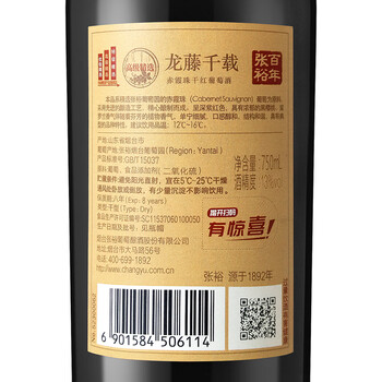 张裕旗下龙藤名珠 高级精选赤霞珠干红葡萄酒750ml*6瓶整箱聚会红酒