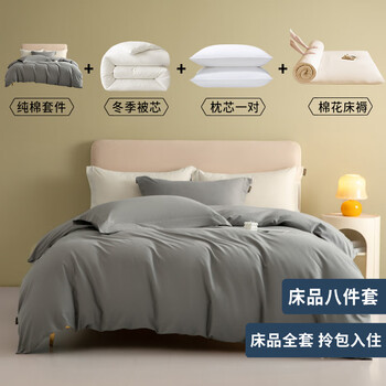 源生活 床上全套八件套 被子四件套枕芯床垫 被芯8斤冬款 1.8米床 灰色