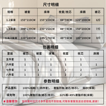 被芯*1 被套*1 床单*1 枕套*2 枕芯*2 床褥*1