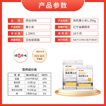 悦谷百味 有机 黄小米 1.25kg(月子米 五谷杂粮 大米伴侣粗纤维无添加粗粮真空装)x1