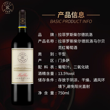 阿根廷拉菲(LAFITE)罗斯柴尔德马尔贝克红葡萄酒 750ml 单瓶装 原装进口红酒