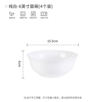 浩雅高温釉下彩景德镇陶瓷餐具面碗汤碗大号饭碗简约纯白6英寸4个装