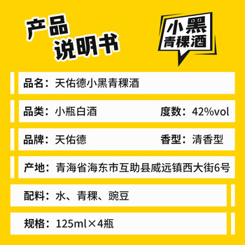青海天佑德 青稞酒(小黑) 42度 清香型白酒 单盒装 125ml*4瓶