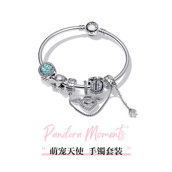 潘多拉(PANDORA)萌宠天使手镯套装银白色浅蓝可爱生日礼物送女友