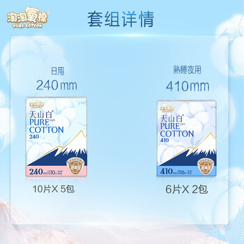 淘淘氧棉天山白消毒级卫生巾纯棉含410量大日夜组合卫生巾套装7包62片(日用50P+熟睡夜用12p)