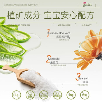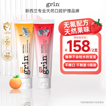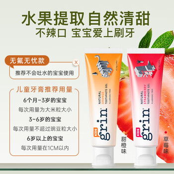 grin宝宝儿童牙膏无氟不含氟0-3-6岁婴幼儿牙膏双支装70g草莓+70g甜橙