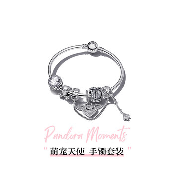 潘多拉(PANDORA)萌宠天使手镯套装银白色浅蓝可爱生日礼物送女友