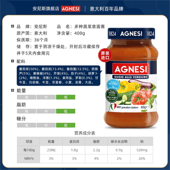 安尼斯多种蔬菜意大利面酱400g意大利原装进口意面酱披萨酱番茄酱调料