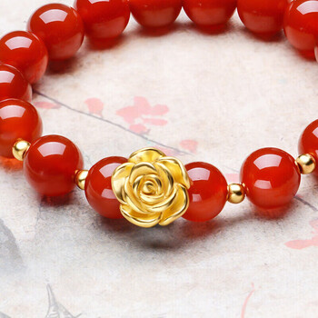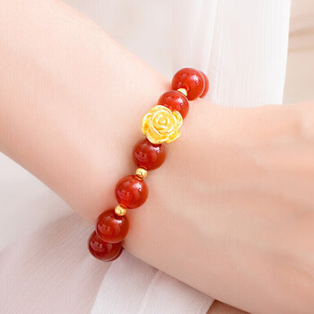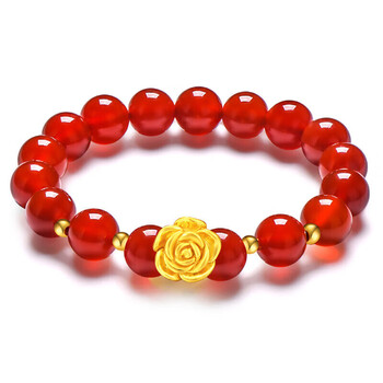 蒂蔻(Tico)足金时尚玫瑰花黄金手链硬金路路通红玛瑙手串转运珠生日礼物
