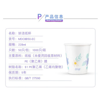 妙洁 一次性纸杯子 50只228ml 茶水加厚食品级