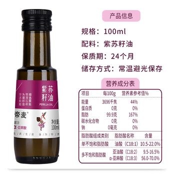 帝麦 食用油 紫苏籽油 冷榨苏子油 苏麻油100ml 热门商品