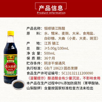 恒顺镇江陈醋 新A陈 5度 500ml 凉拌海鲜饺子醋 0防腐剂