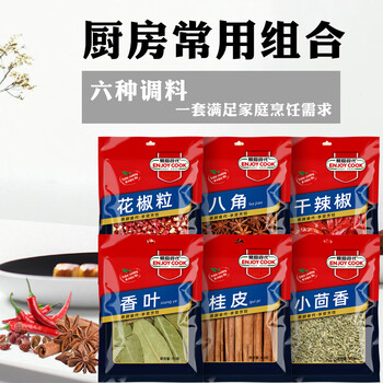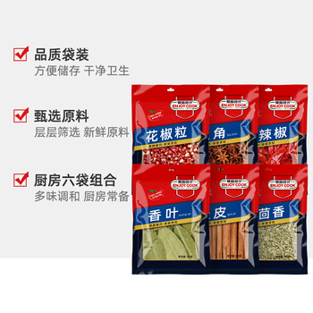 小茴香40g/袋*1 香叶15g/袋*1 桂皮40g/袋*1 干辣椒50g/袋*1 八角30g/袋*1 花椒20g/袋*1
