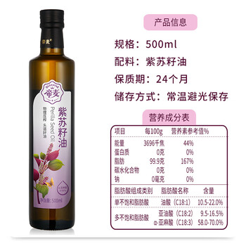 帝麦紫苏籽油500ml 直饮热炒凉拌食用油 苏子油 苏麻油带礼盒年货送礼