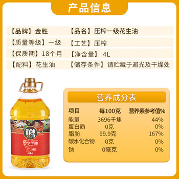金胜鲜油坊【保真花生油】压榨一级浓香花生油4L 年货礼品福利团购