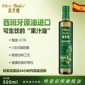 欧贝拉(Oleo Bella)【保真橄榄油】欧洲原油进口特级初榨橄榄油 500ml 炒菜食用油