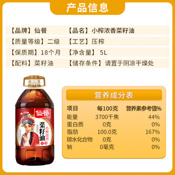 仙餐牌食用油 小榨浓香 四川压榨非转基因菜籽油 5L 四川风味