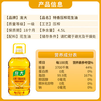 龙大【保真花生油】 食用油 压榨一级 特香花生油 4.5L 新花生新鲜油