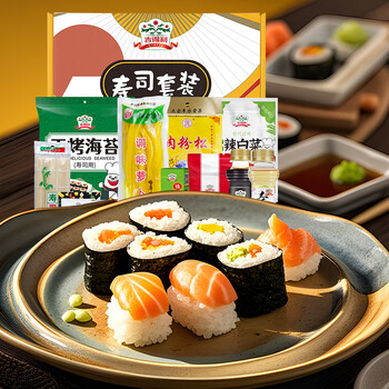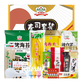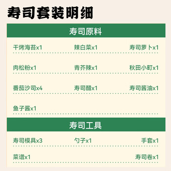吉得利 寿司套装(寿司米1袋、肉粉松1袋、青芥辣1袋、寿司萝卜条1袋、寿司酱油1瓶、寿司醋1瓶、寿司海苔10枚、辣白菜100g、鱼子酱15g*、番茄沙司10g、寿司饭勺、模具(一套3个)、制作说明、寿司帘、一次性手套)