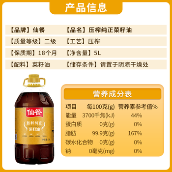 仙餐牌食用油 四川风味压榨菜籽油 5L